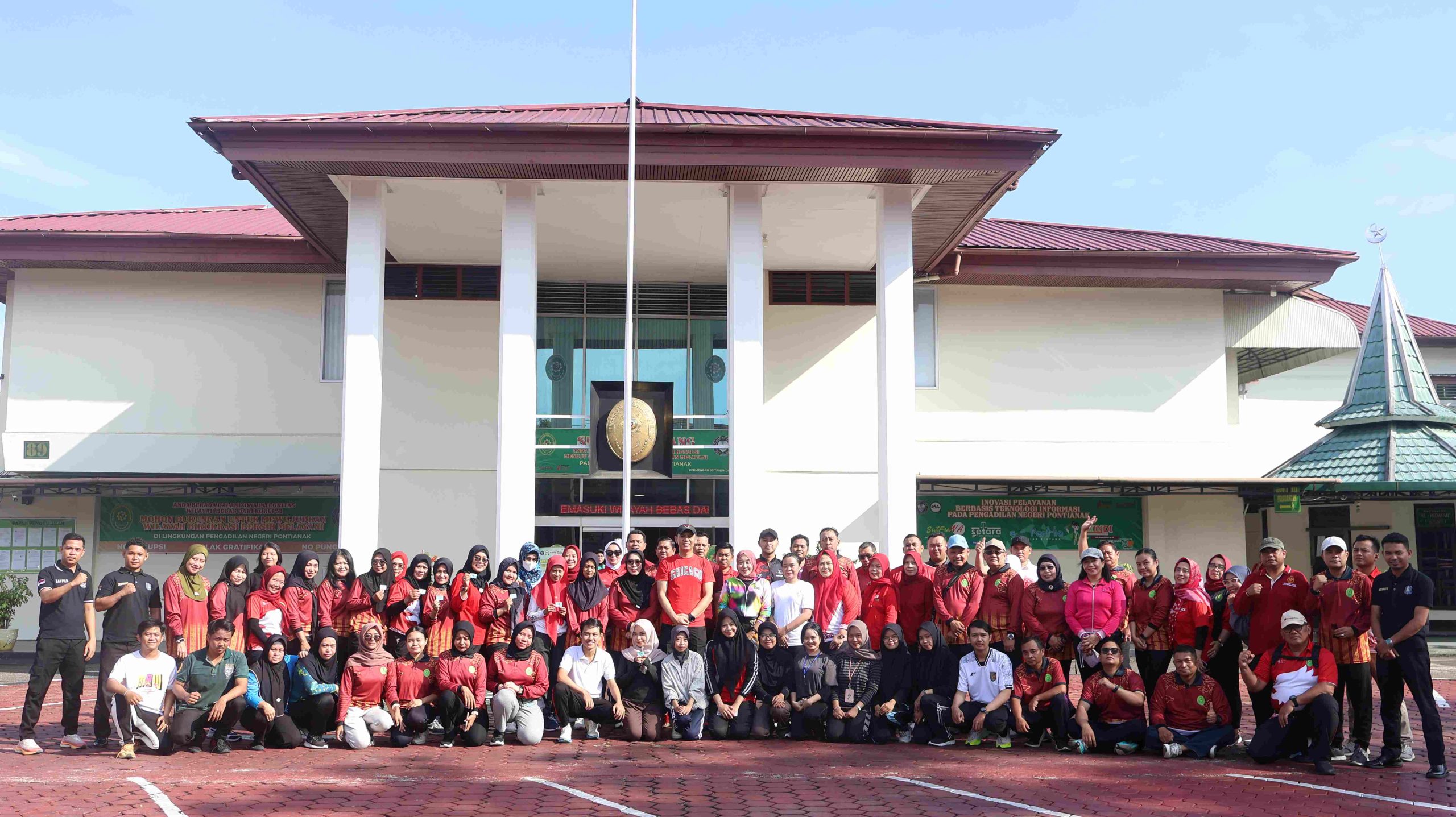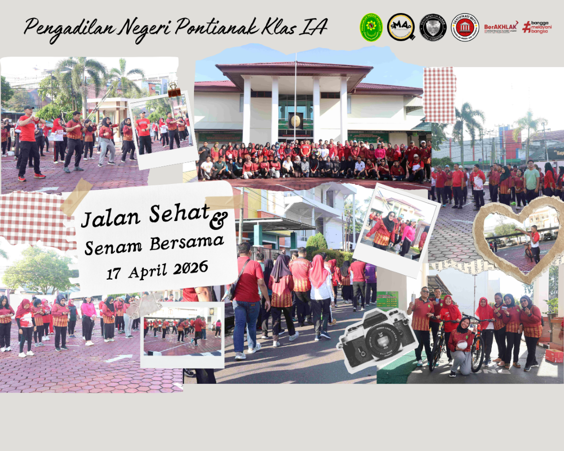 Pontianak, KalBar – Keluarga Pengadilan Negeri Pontianak menyelenggarakan Kegiatan Jumat Sehat dengan Jalan Santai dan Senam Bersama. Kegiatan tersebut diikuti oleh Seluruh Hakim, Pejabat Struktural, Pejabat Fungsional, dan Aparatur Sipil Negara di Pengadilan Negeri Pontianak.