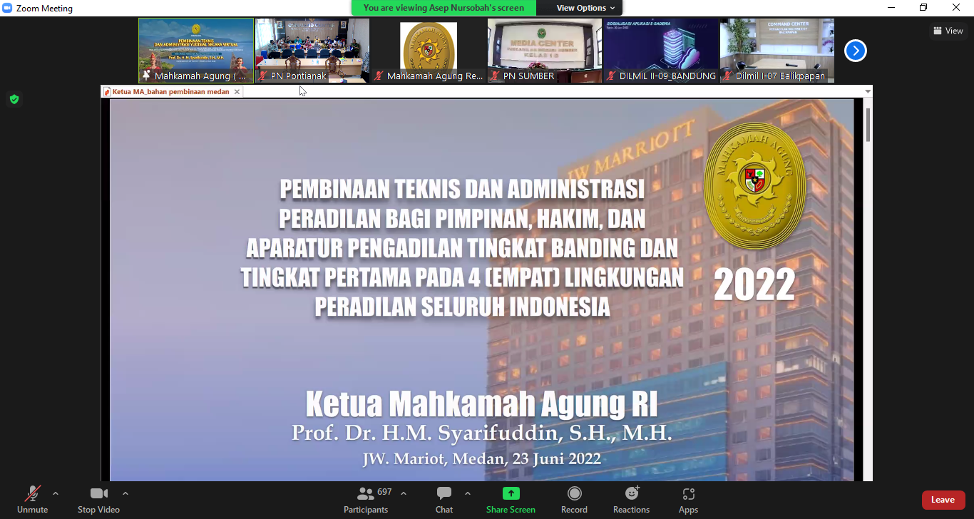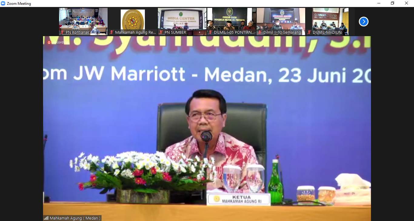 Pontianak, KalBar – Pada Kamis (23/06/2022) siang diadakan acara Pembinaan Teknis dan Administrasi Peradilan Bagi Pimpinan, Hakim, dan Aparatur Pengadilan Tingkat Banding dan Tingkat Pertama Pada 4 (Empat) Lingkungan Peradilan Seluruh Indonesia bertempat di Medan, dan diikuti secara daring oleh Pengadilan Negeri Pontianak Kelas 1A melalui aplikasi zoom meeting bertempat di ruang Command Center Pengadilan Negeri Pontianak Kelas 1A. Pembinaan teknis secara online ini dihadiri oleh KPN Pontianak Kelas 1A, H. Akhmad Fijiarsyah Joko Sutrisno, S.H., M.H., WKPN Pontianak Kelas 1A, Sri Harsiwi, S.H., M.H., para Hakim, Panitera, dan Sekretaris PN Pontianak Kelas 1A.